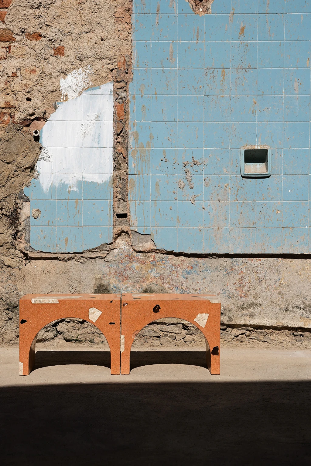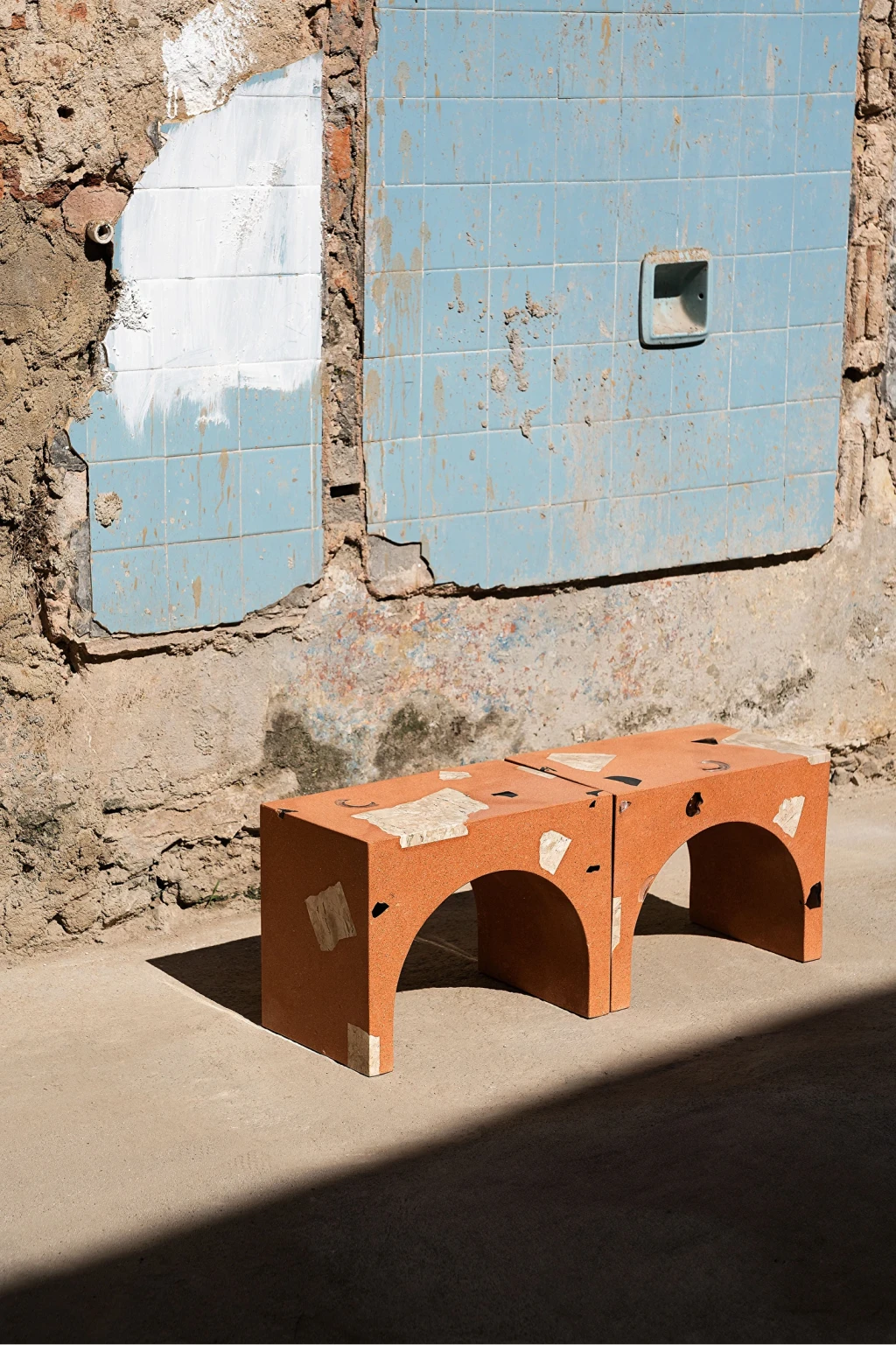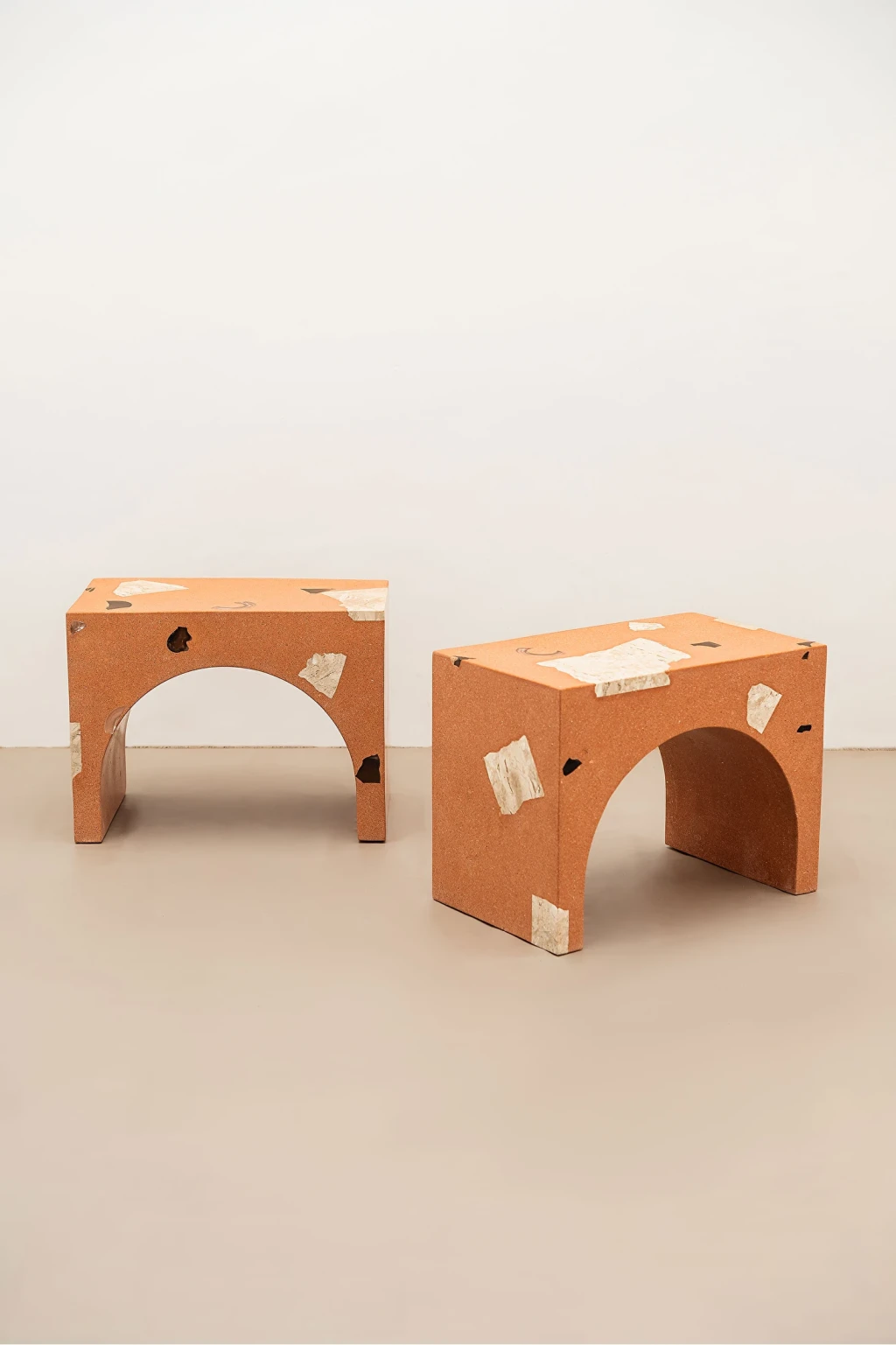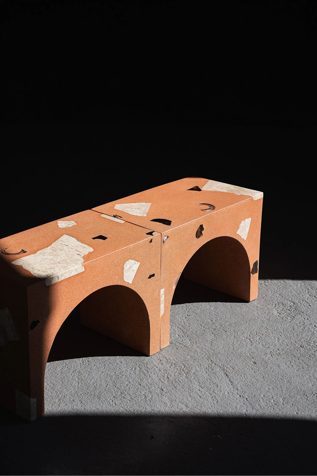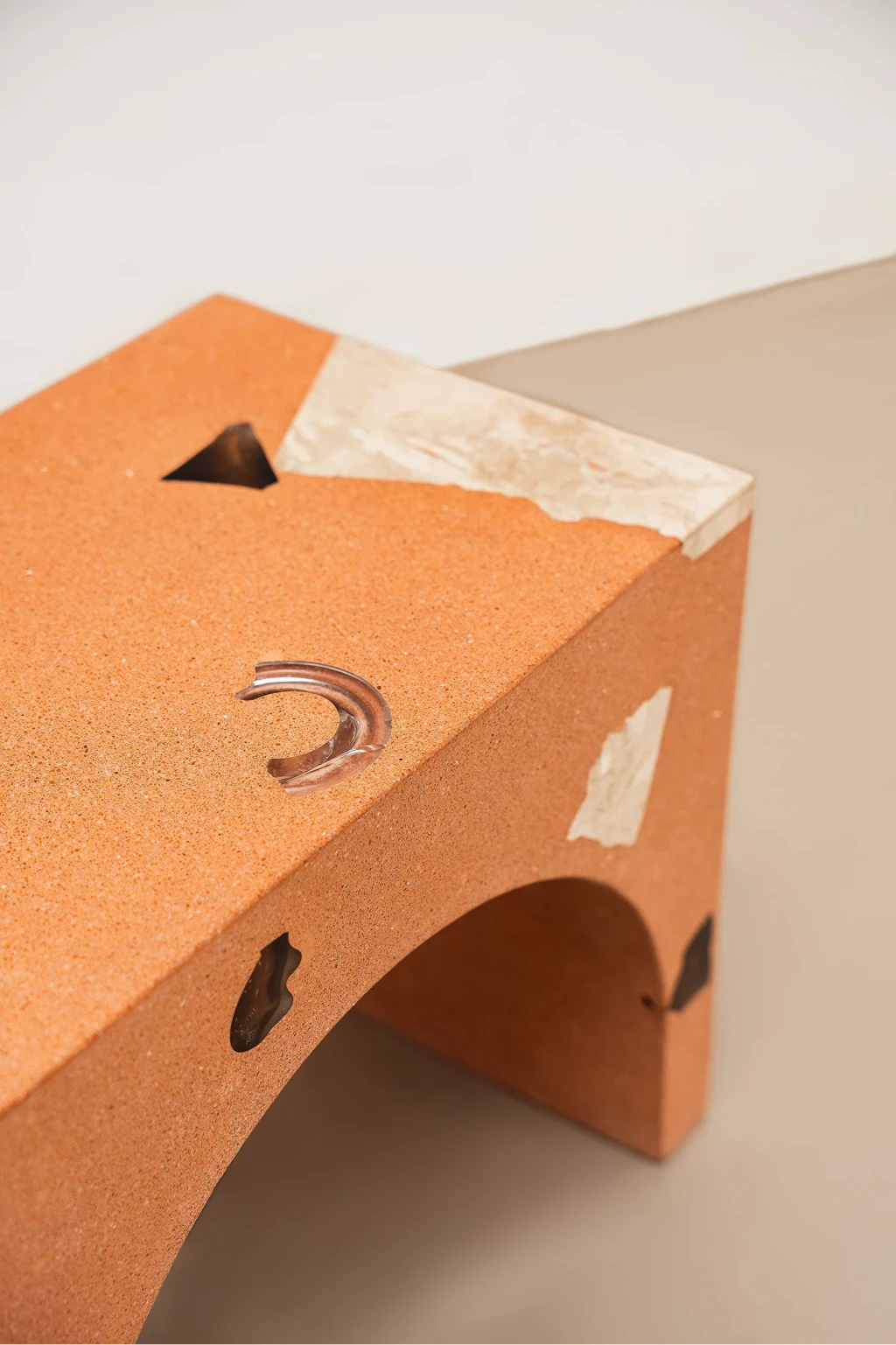 Banco feito em compósito a base de tijolo cerâmico reciclado triturado com agregados em vidro e mármore Bege Bahia.