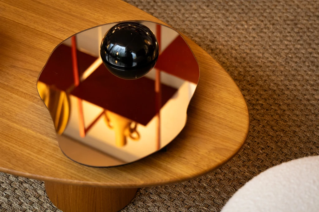 Espelho pequeno da Série Ciclos, que também pode ser utilizado como bandeja decorativa. Possui base em madeira e detalhe de semiesfera em resina preta, conferindo contraste e organicidade ao design. Peça artesanal, delicada e única, ideal para apoiar sobre móveis ou fixar na parede como elemento artístico. Limpar apenas com pano seco, sem uso de produtos químicos ou abrasivos.