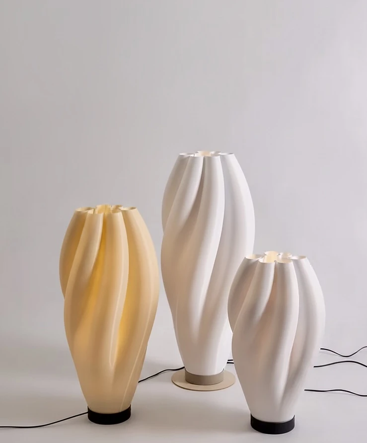Inspirada nos recortes orgânicos de Henri Matisse, a coleção tridimensionaliza as formas do artista criando nuances e sombras únicas. Cúpula impressa em branco ou âmbar, base em alumínio com pintura eletrostática (areia ou cinza chumbo), fio preto com interruptor de pé e lâmpada dicroica LED.