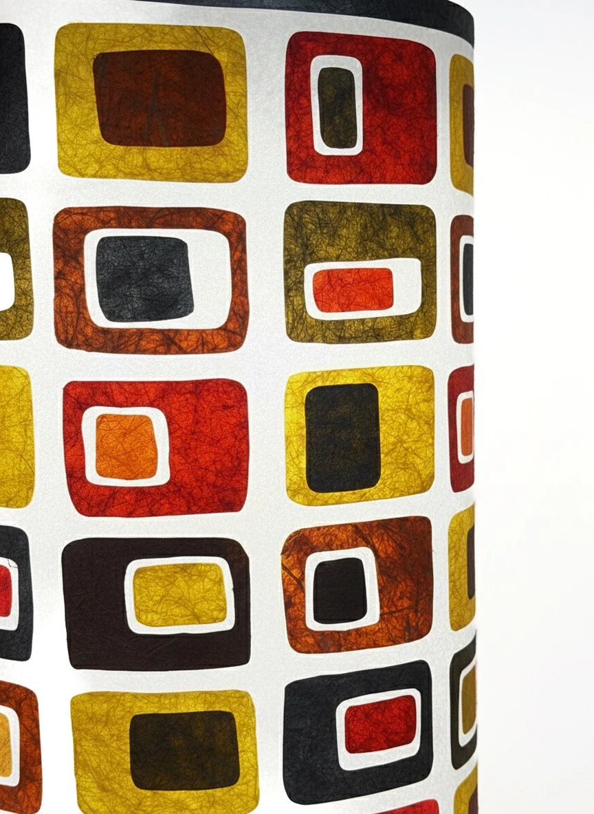 Luminária inspirada no artista Piet Mondrian, esculpida à mão em papel de fibra vegetal colorido manualmente. Peça única produzida com materiais de reuso e baixo impacto ambiental.