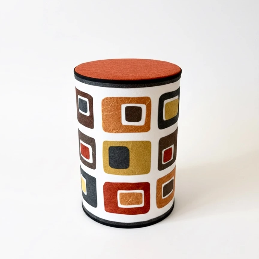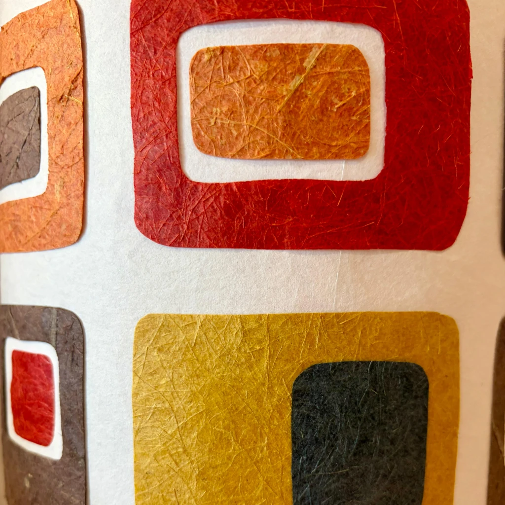 Luminária inspirada no artista Piet Mondrian, esculpida à mão em papel de fibra vegetal colorido manualmente. Peça única produzida com materiais de reuso e baixo impacto ambiental.