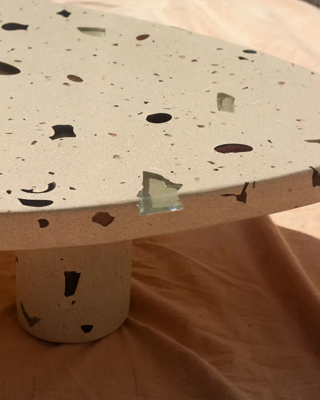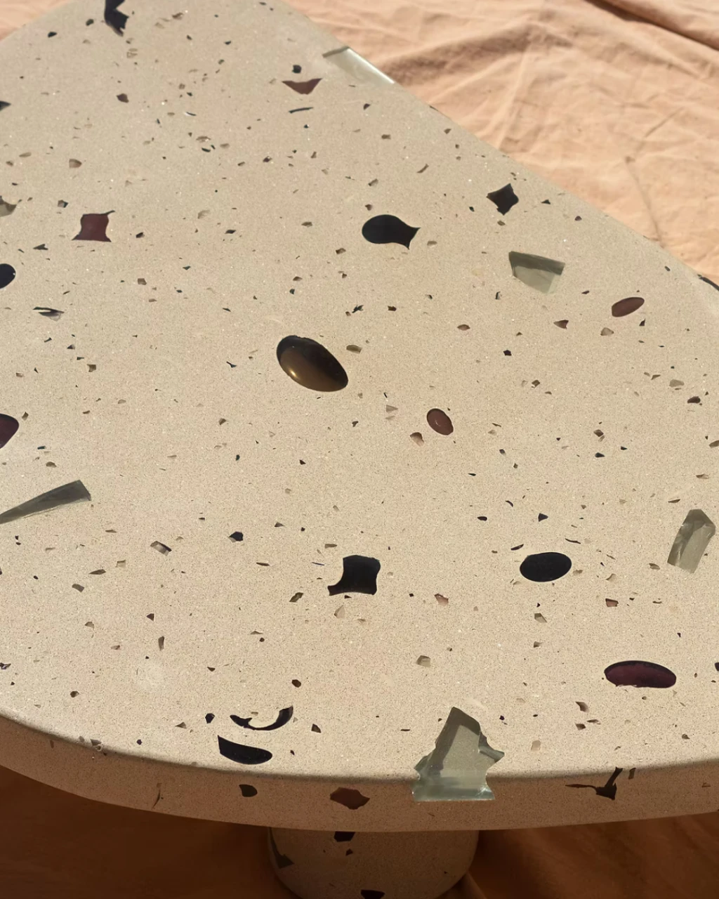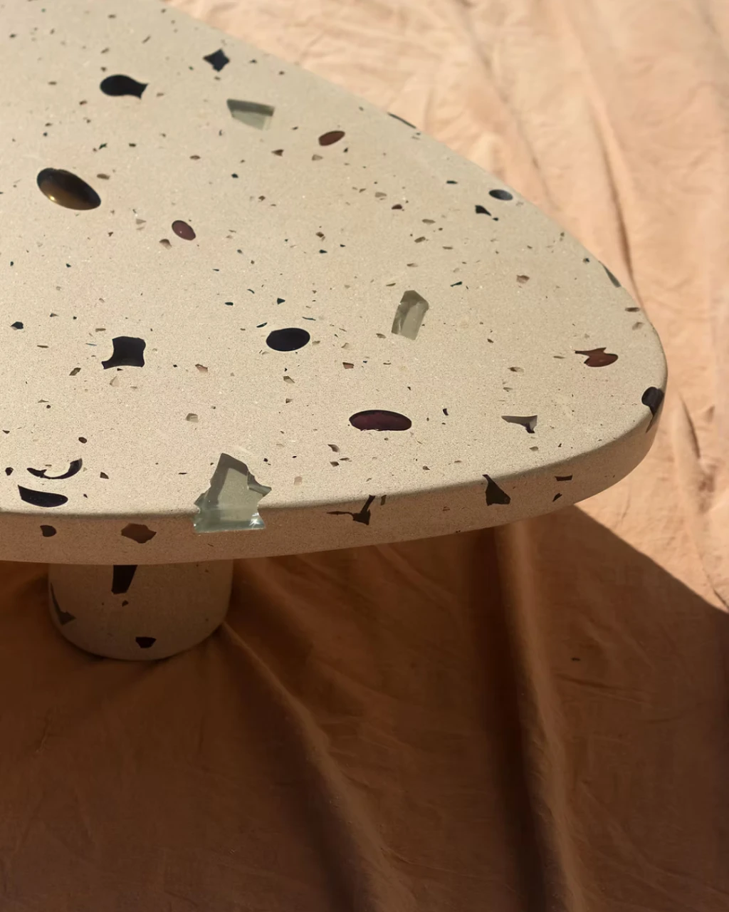 Parte da coleção MONOMORFO, a Mesa de Centro Mono Bege possui tampo em formato amorfo com 3 variações possíveis e é composta por cristais de vidro oriundos dos descartes de uma fábrica em Minas Gerais. Esses resíduos contribuem para criação de padrões únicos e coloridos para cada mesa produzida.