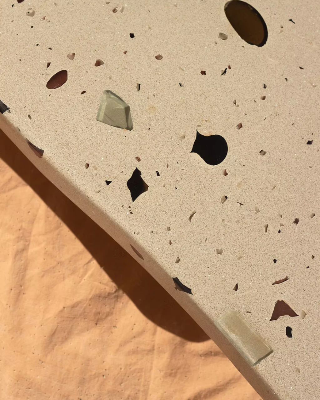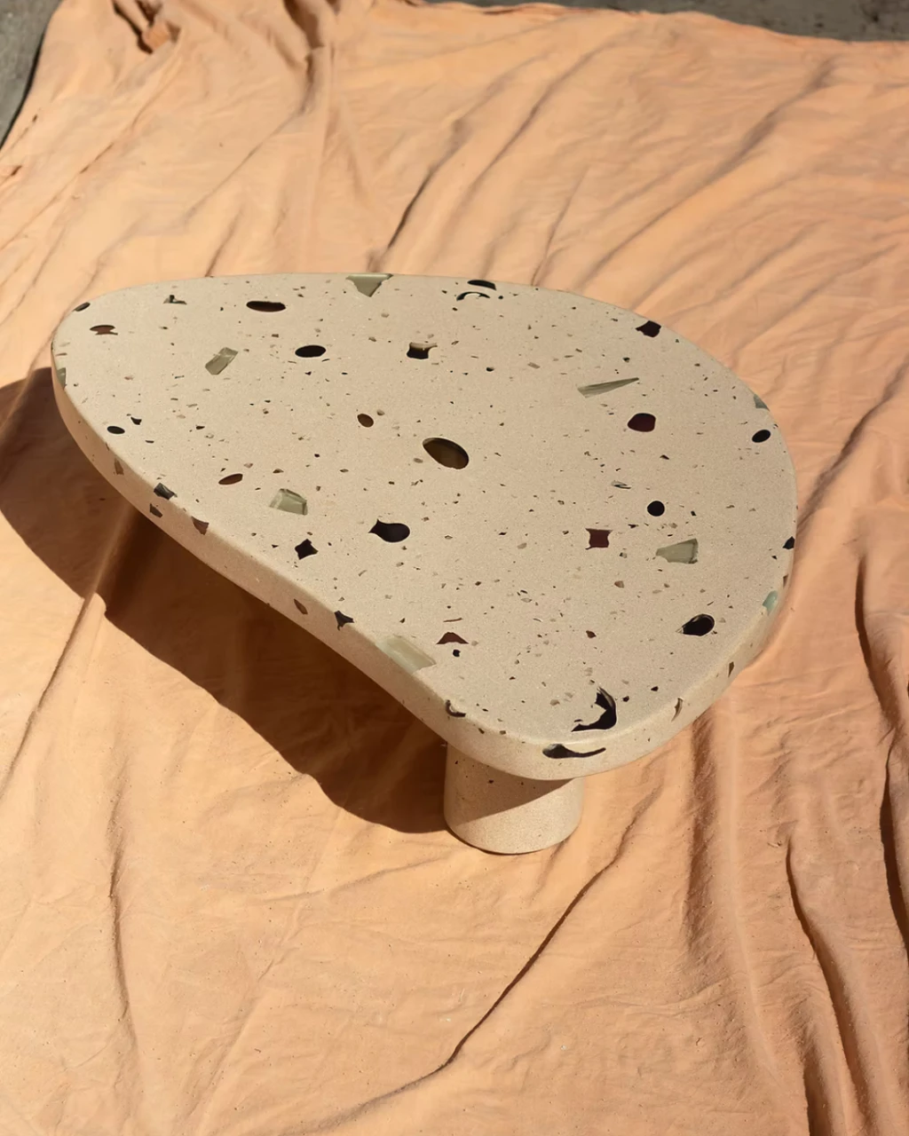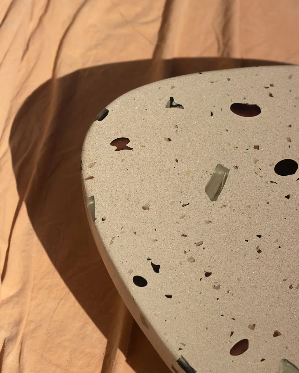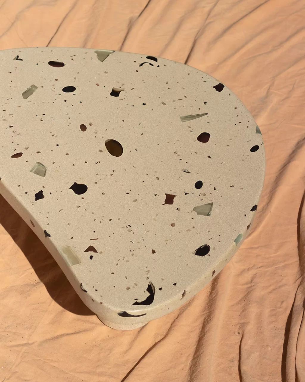 Parte da coleção MONOMORFO, a Mesa de Centro Mono Bege possui tampo em formato amorfo com 3 variações possíveis e é composta por cristais de vidro oriundos dos descartes de uma fábrica em Minas Gerais. Esses resíduos contribuem para criação de padrões únicos e coloridos para cada mesa produzida.