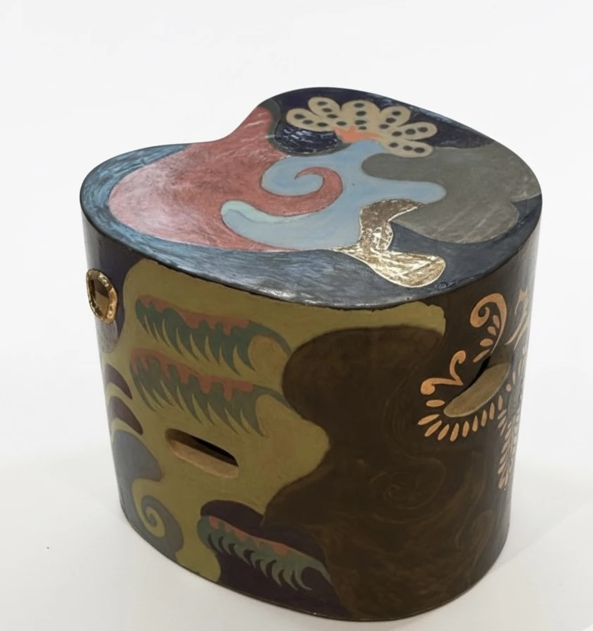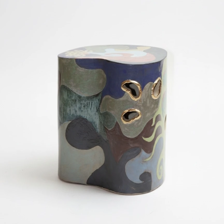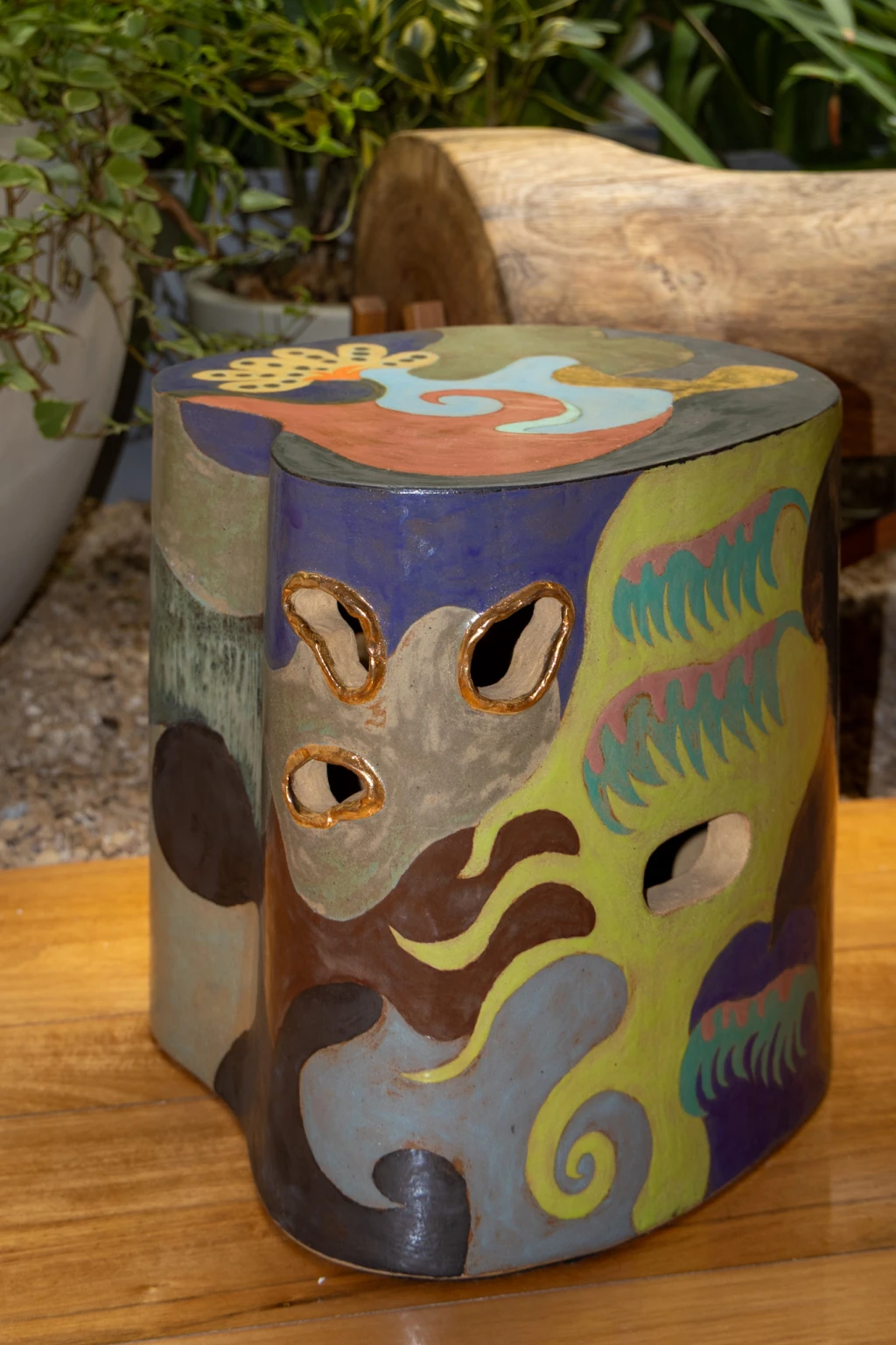 Banco decorativo em cerâmica com acabamento esmaltado de alta temperatura. Esta peça versátil funciona como assento, apoio lateral, mesa de centro ou elemento decorativo em ambientes internos e externos.