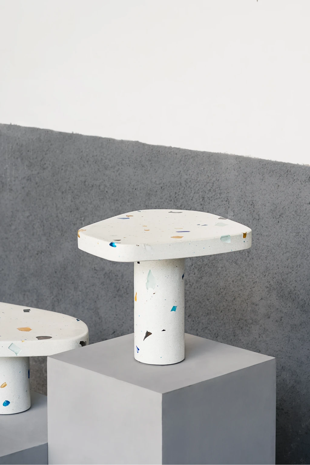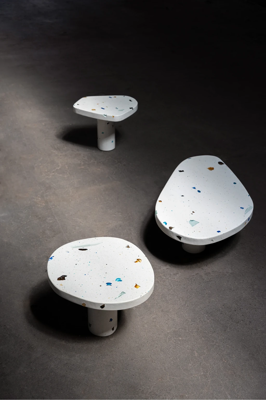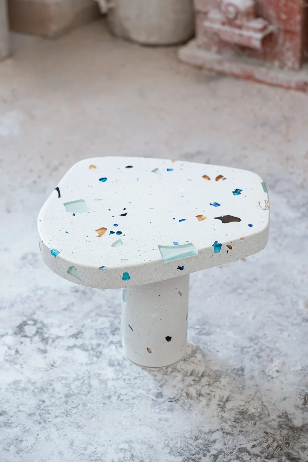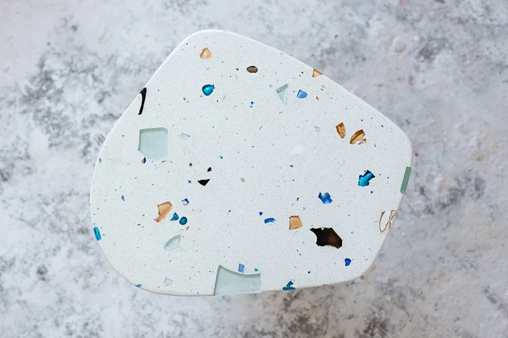 Parte da coleção MONOMORFO, a Mesa Lateral Mono possui tampo em formato amorfo com 4 variações possíveis e é composta por cristais de vidro oriundos dos descartes de uma fábrica em Minas Gerais. Esses resíduos contribuem para criação de padrões únicos e coloridos para cada mesa produzida.