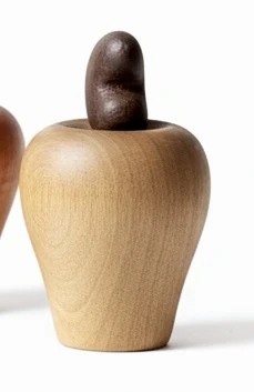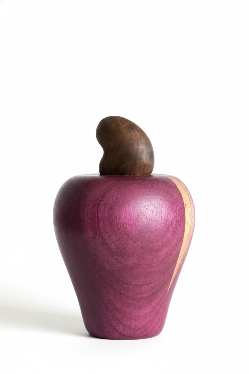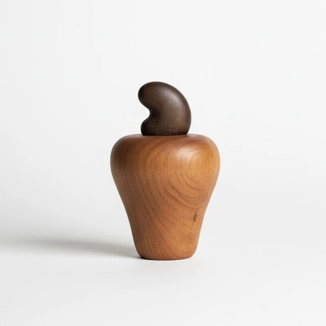 Caju torneado em madeira maciça, inspirado nas tradicionais caixas de doce vendidas em mercearias do interior nordestino. Produzido em madeiras nobres brasileiras (maracatiara, roxinho, peroba-rosa, freijó ou pau-marfim), com castanha em imbuia. Acabamento em óleo mineral e cera orgânica que preserva a textura e aroma naturais. Cada peça é única devido às características próprias da madeira. Cada caju é vendido separadamente.