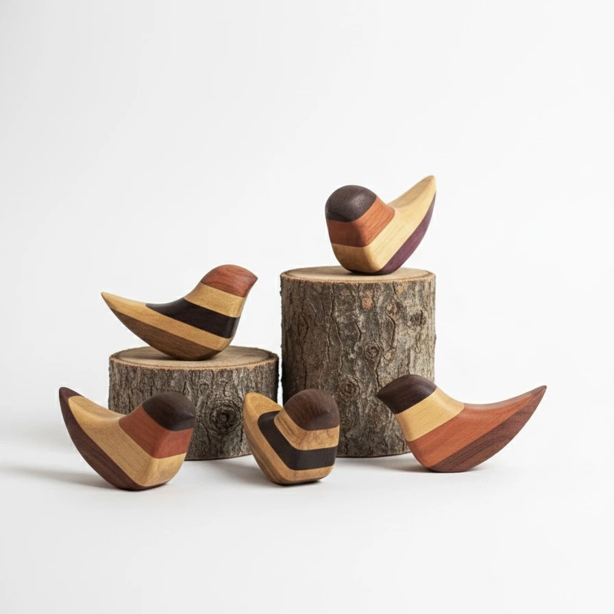 Pássaros esculpido em madeira. Disponível em mix de madeiras nobres, com bico voltado para esquerda ou direita. Acabamento em óleo mineral e cera orgânica que preserva a textura e aroma naturais da madeira. Cada peça é única devido às características próprias da madeira.