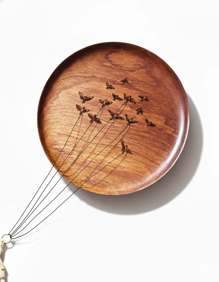 Prato decorativo em madeira torneada de peroba-rosa com gravação a laser de pássaros em revoada. Pequeno Príncipe em madeira de marupá suspenso por fios. Peça artesanal que evidencia os veios naturais e a tonalidade característica da madeira. Acabamento em óleo mineral e cera orgânica que preserva a textura e aroma naturais. Cada peça é única devido às características próprias da madeira.