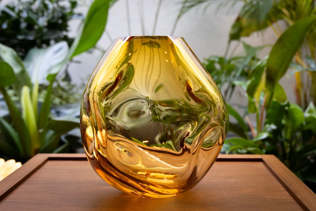 Vaso escultórico produzido em cristal soprado artesanalmente. A coleção Caos se destaca por peças robustas e sólidas, com vidro de espessura generosa que confere peso e presença marcante.