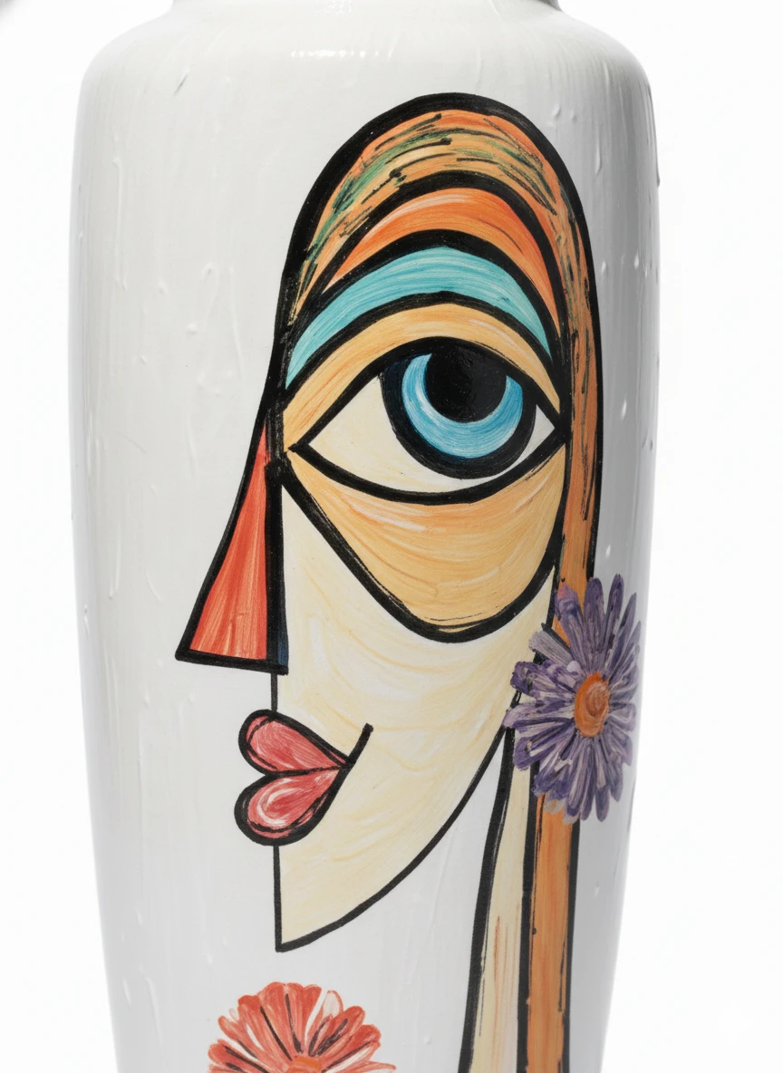 Vaso em cerâmica branca pintado à mão apresentando rosto feminino estilizado com olho azul expressivo, cabelos em tons terrosos e flores decorativas. Peça artística única, cada vaso possui variações de pintura.
