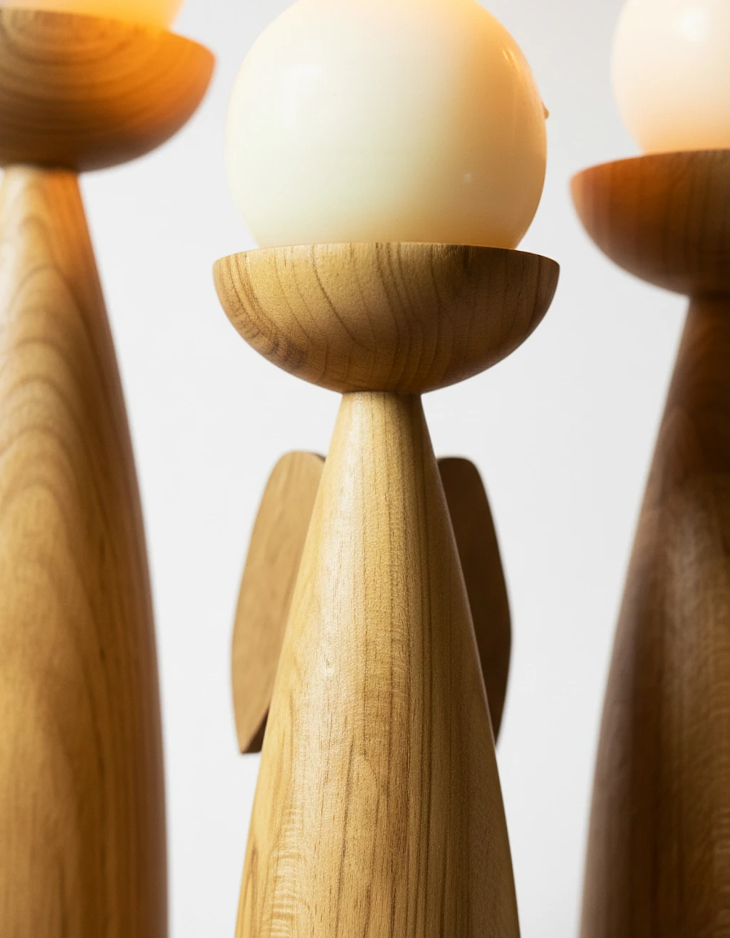 Conjunto de 3 castiçais em madeira torneada nos tamanhos P (9 cm x 23,5 cm x 9 cm), M (9 cm x 26,5 cm x 9 cm) e G (9 cm x 29,5 cm x 9 cm), com formato de anjos estilizados. Produzidos em madeiras de freijó, com asas delicadas e suporte arredondado para velas. Peças artesanais que evidenciam os veios naturais da madeira. Acabamento em óleo mineral e cera orgânica que preserva a textura e aroma naturais. Cada castiçal é único devido às características próprias da madeira.