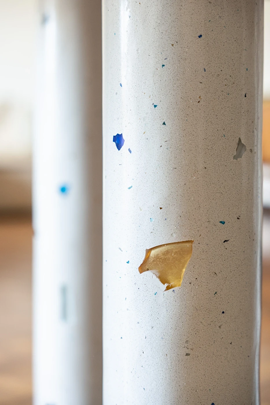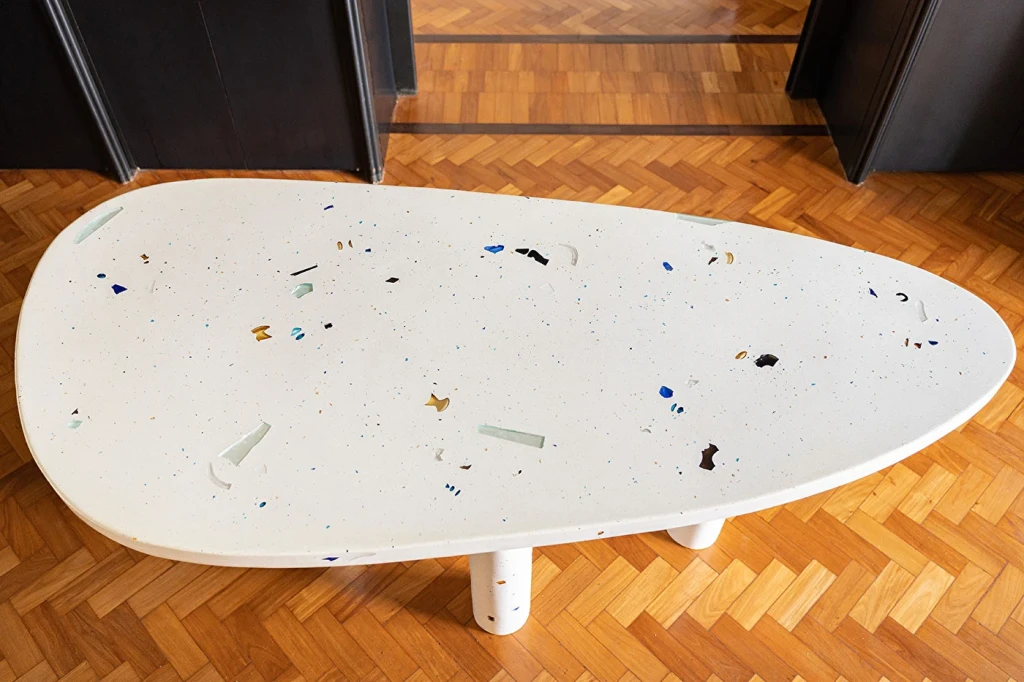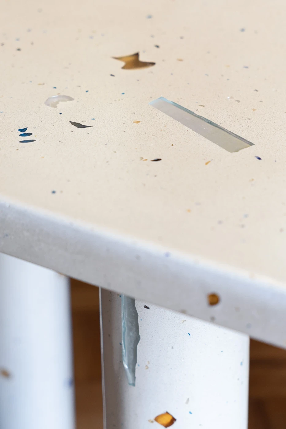 Parte da coleção MONOMORFO, a Mesa Lateral Mono possui tampo em formato amorfo com 4 variações possíveis e é composta por cristais de vidro oriundos dos descartes de uma fábrica em Minas Gerais. Esses resíduos contribuem para criação de padrões únicos e coloridos para cada mesa produzida.