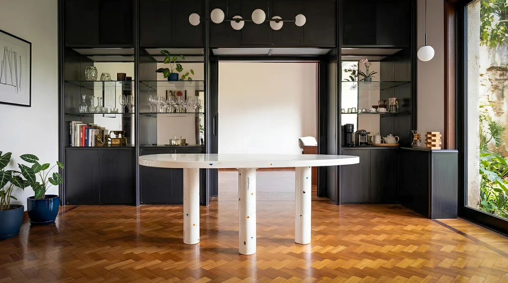 O tampo se apoia sobre pé cilíndrico sólido único que por conta do seu peso garante estabilidade para mesa e leveza visual.